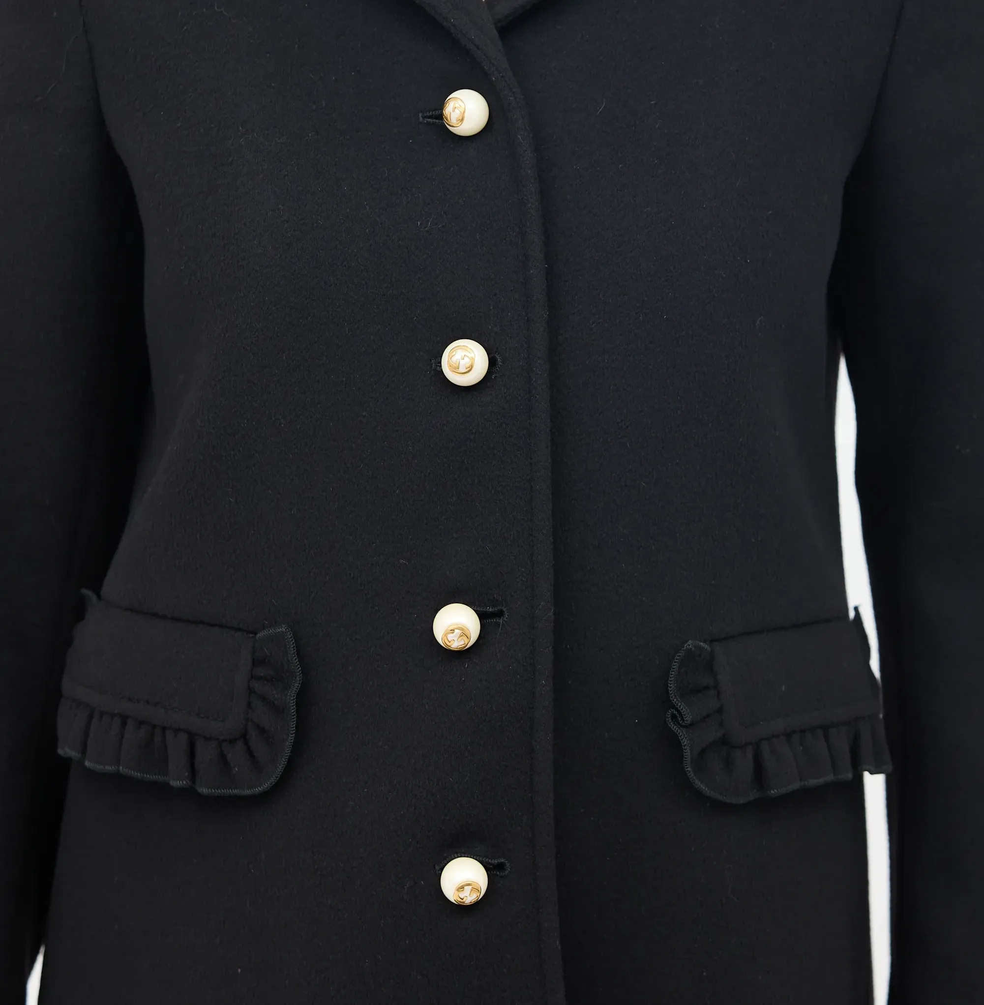 Over it all, a black wool Gucci4 coat with ruffled edges and pearl buttons, doing the heavy lifting so the rest didn’t have to. Grey wool gloves with fur cuffs, and cream Arran bobble hat pulled down. Black umbrella.